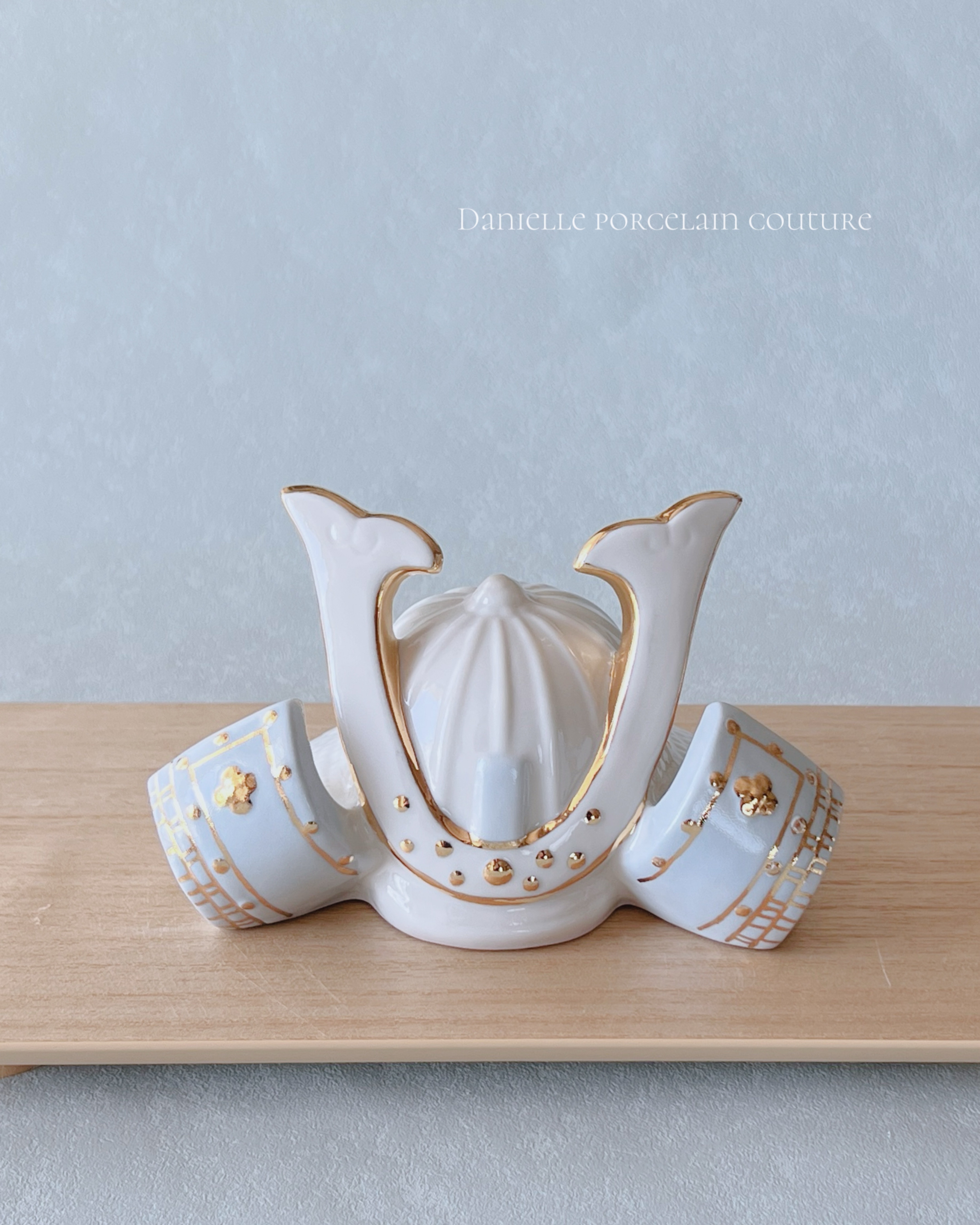 九谷焼き兜に、淡い空色カラー×華やかな本金ゴールドで仕上げました。