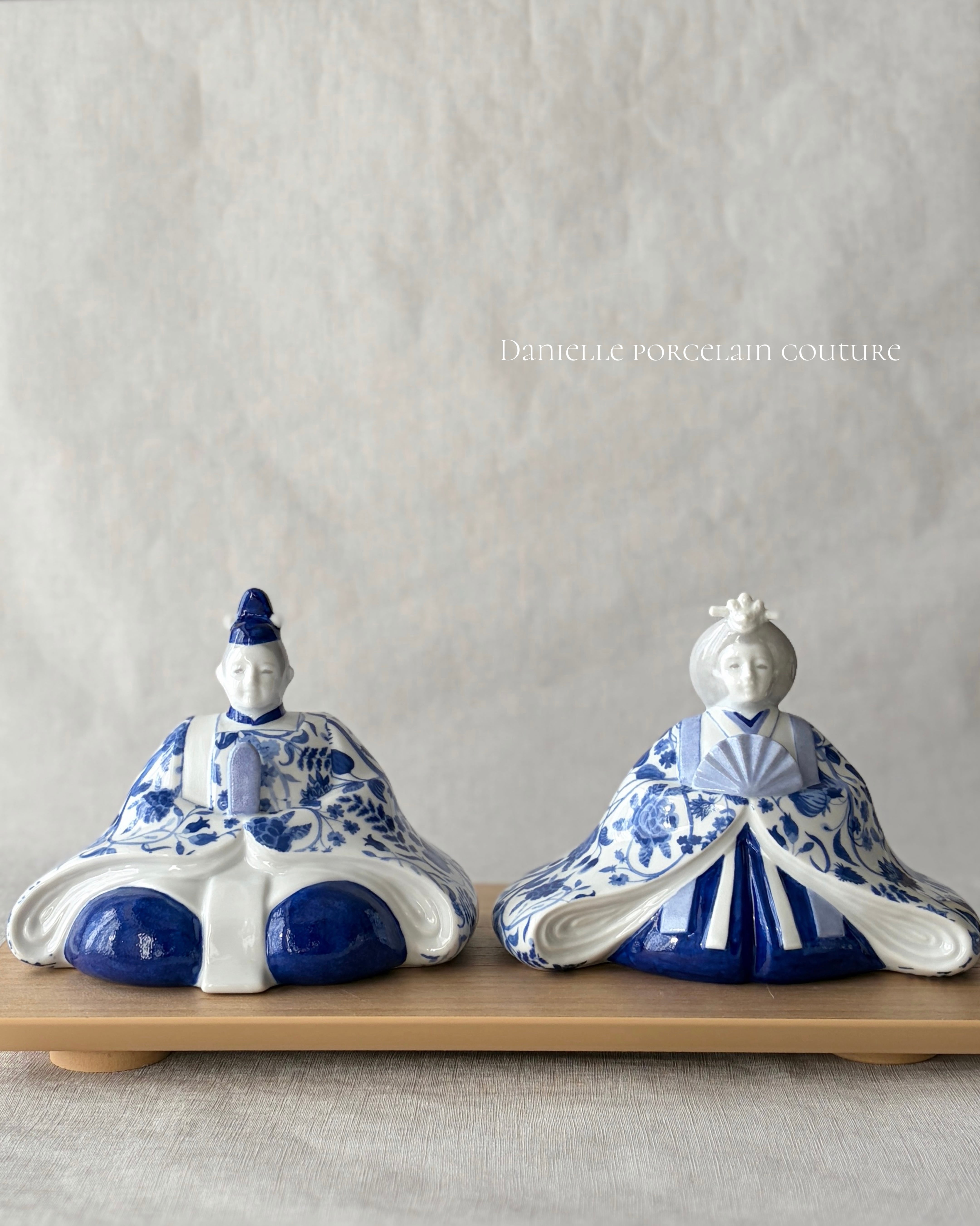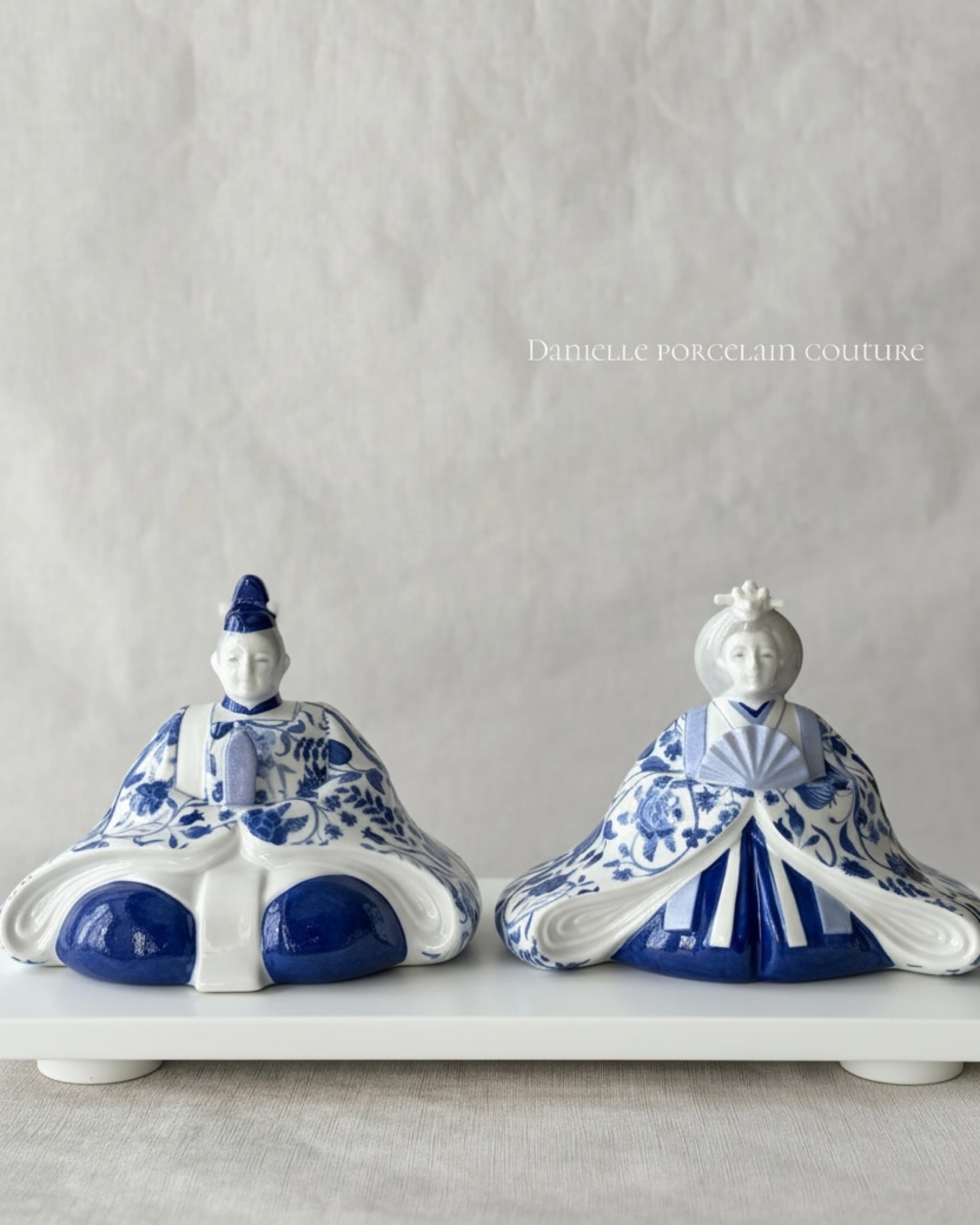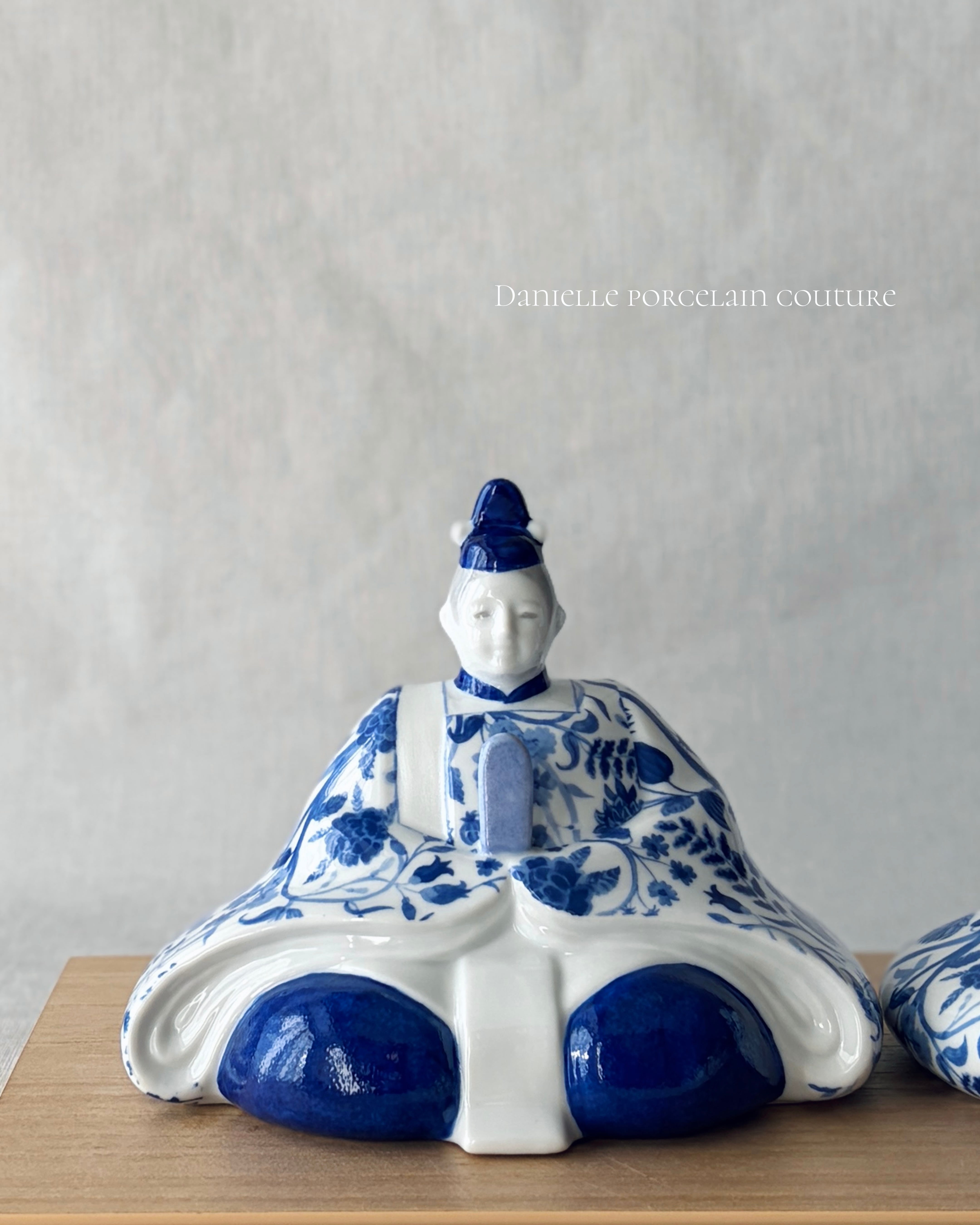 ふんわりと柔らかな白磁に、ブルーの優美な絵柄が映える陶器の雛人形。