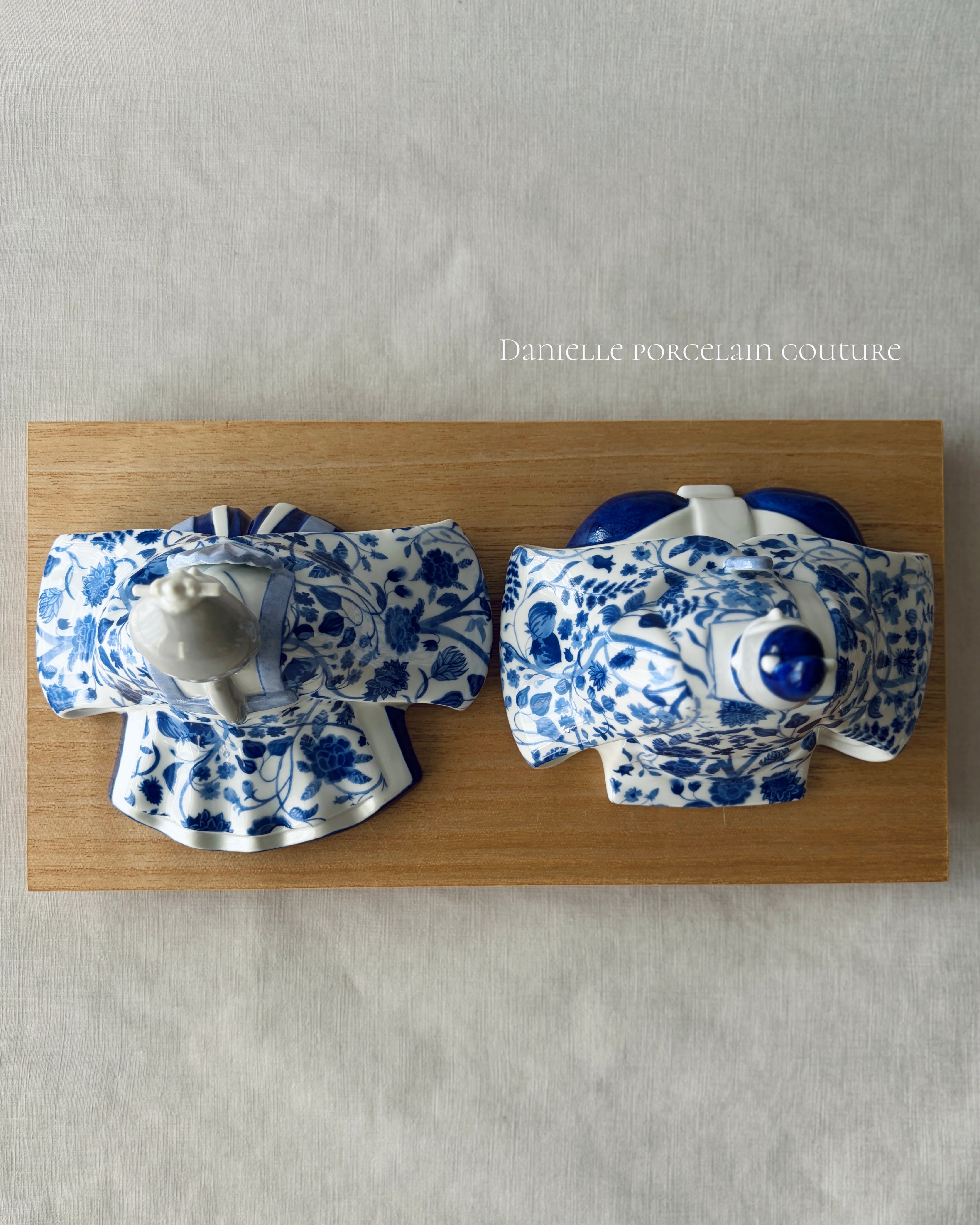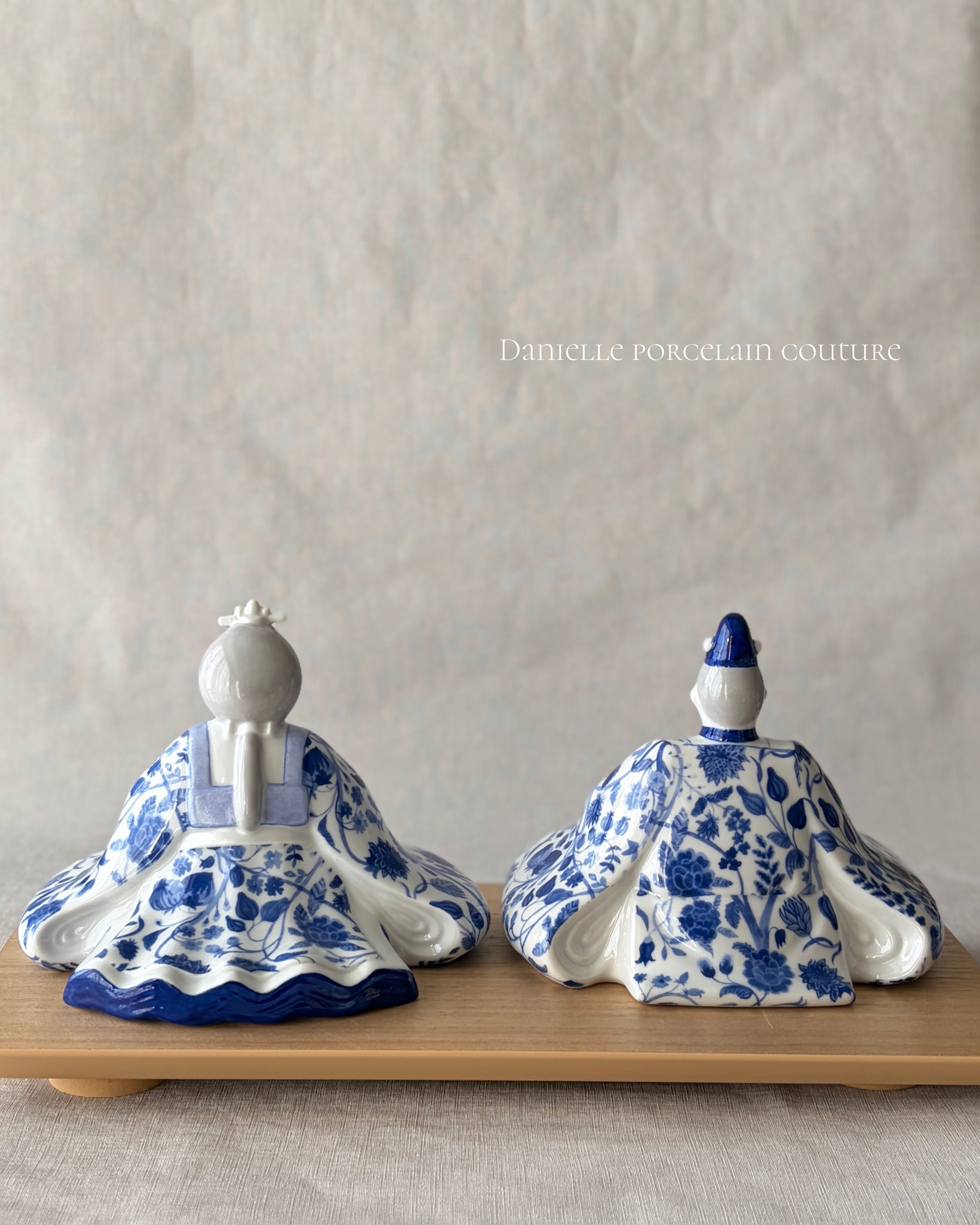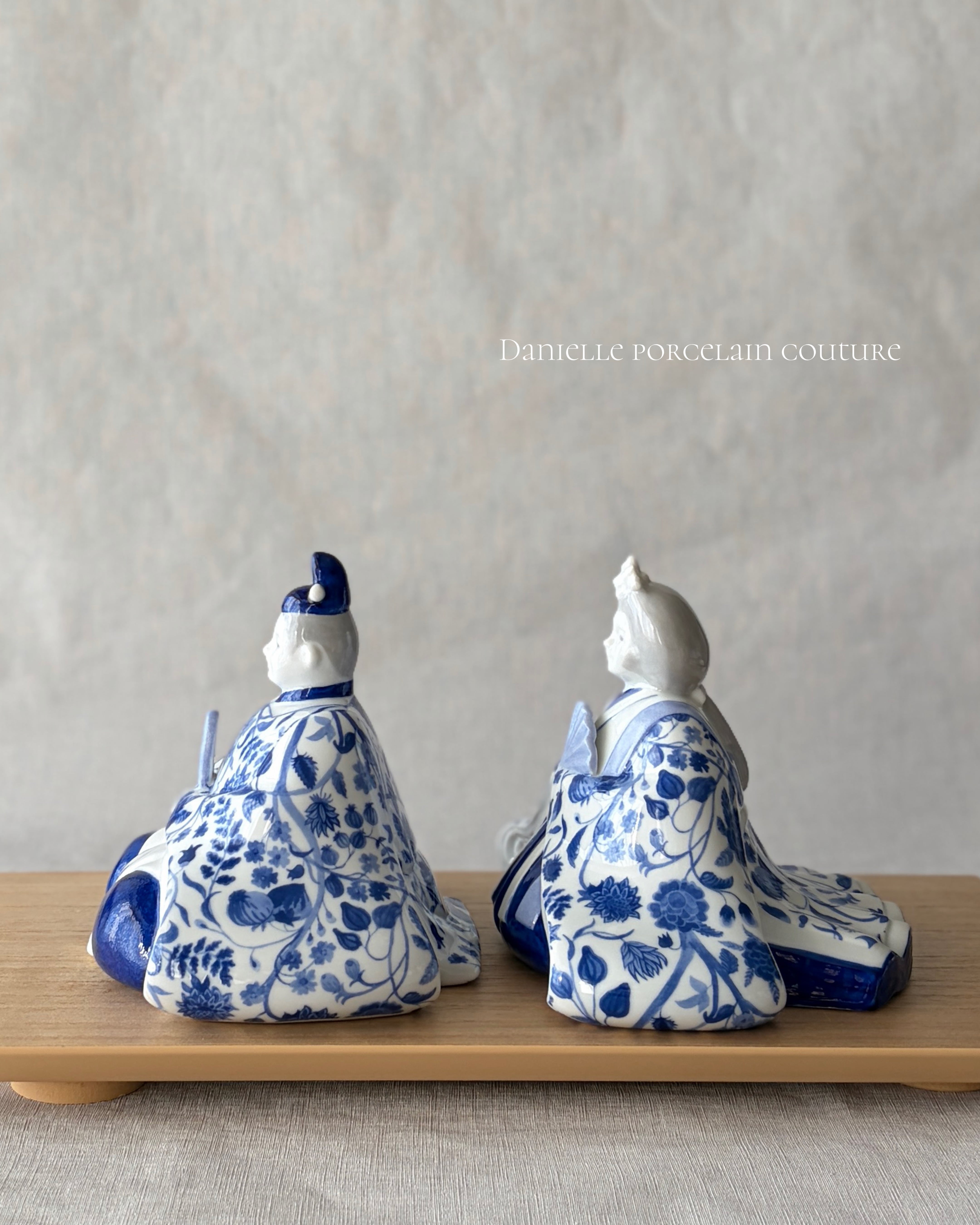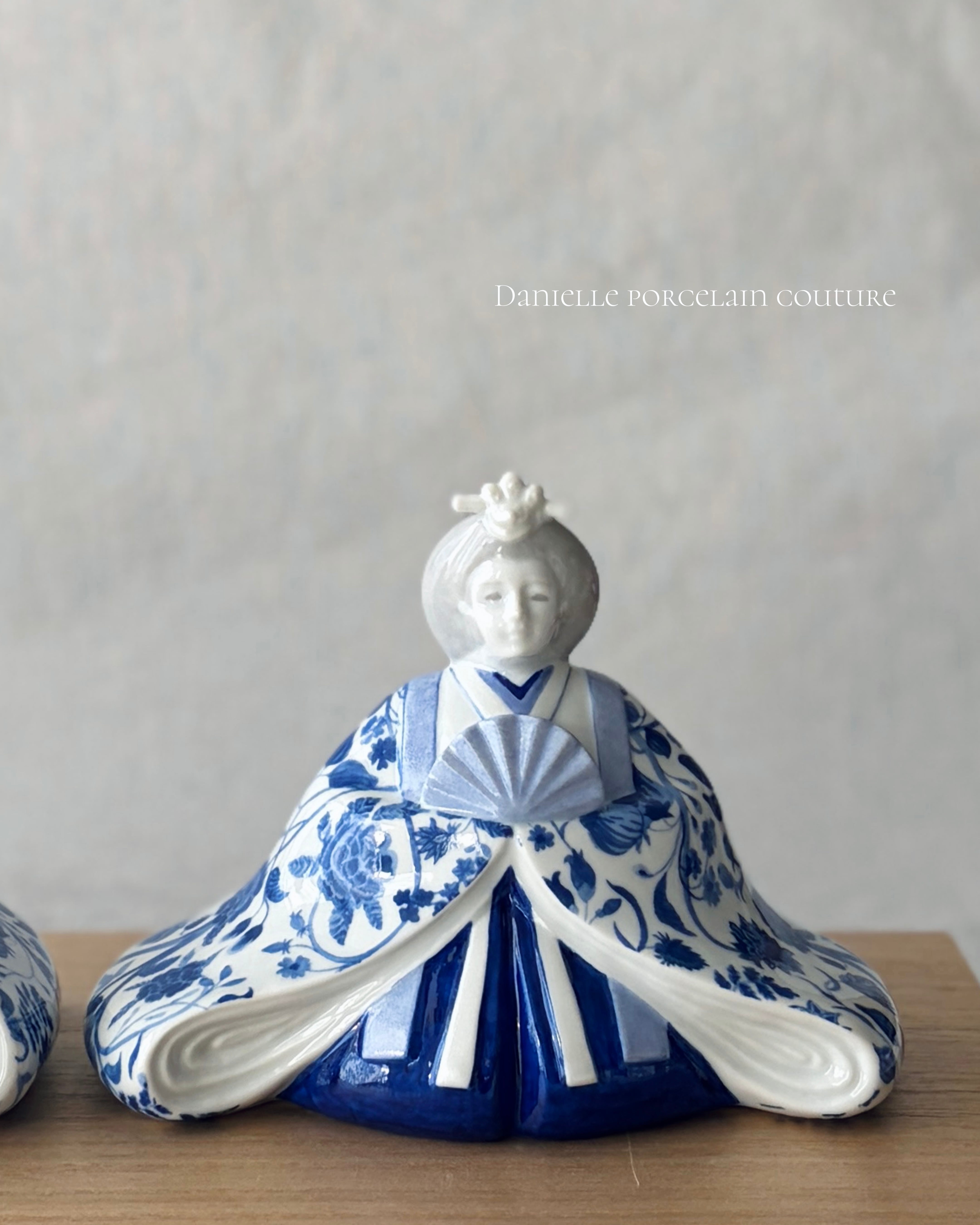 ふんわりと柔らかな白磁に、ブルーの優美な絵柄が映える陶器の雛人形。