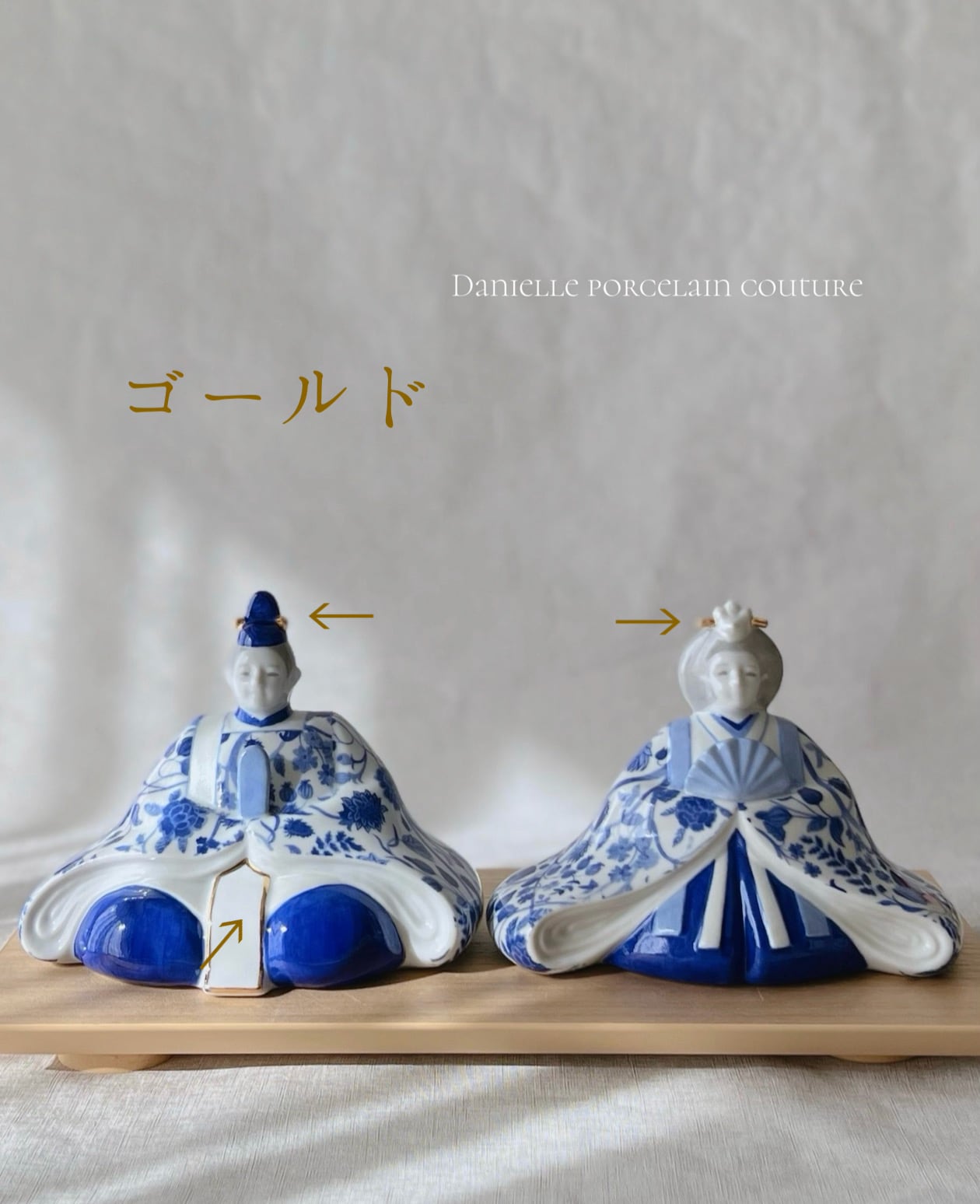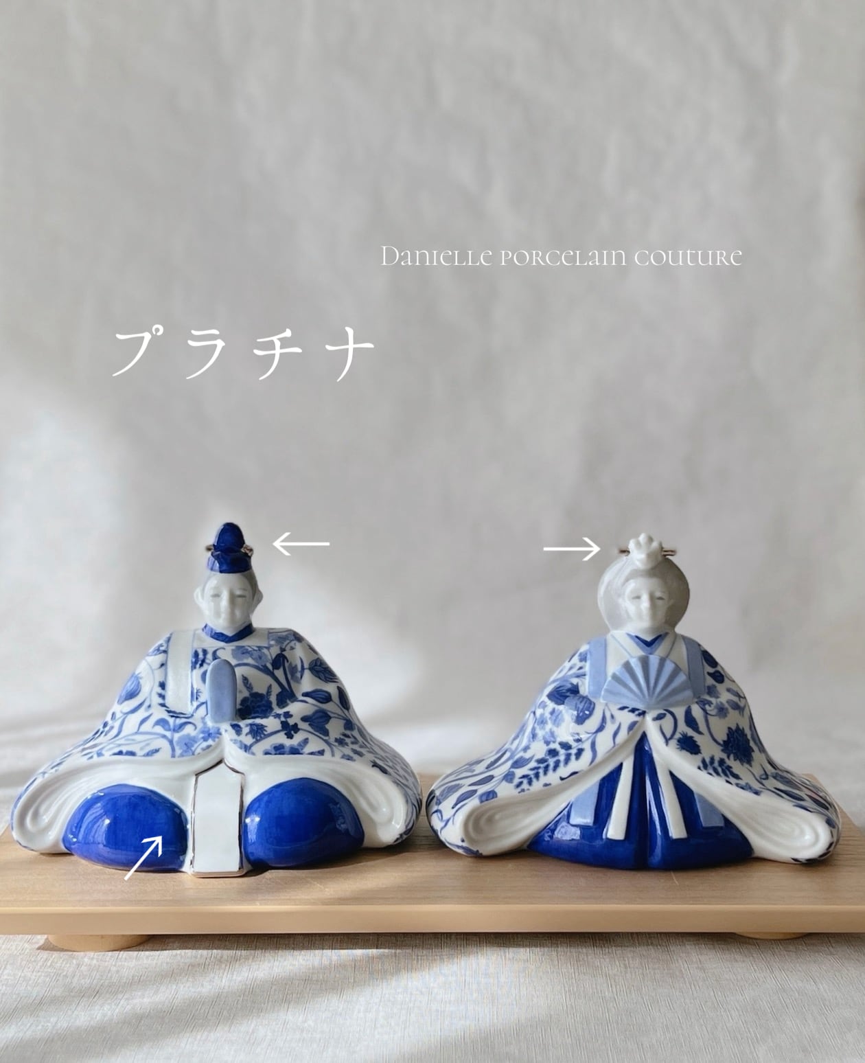 こちらは、白磁に深いブルーが引き立つ『雛人形 ブルーシリーズ』です。プラチナもゴールドもまだ塗っていないので、ご希望の方で仕上げます。