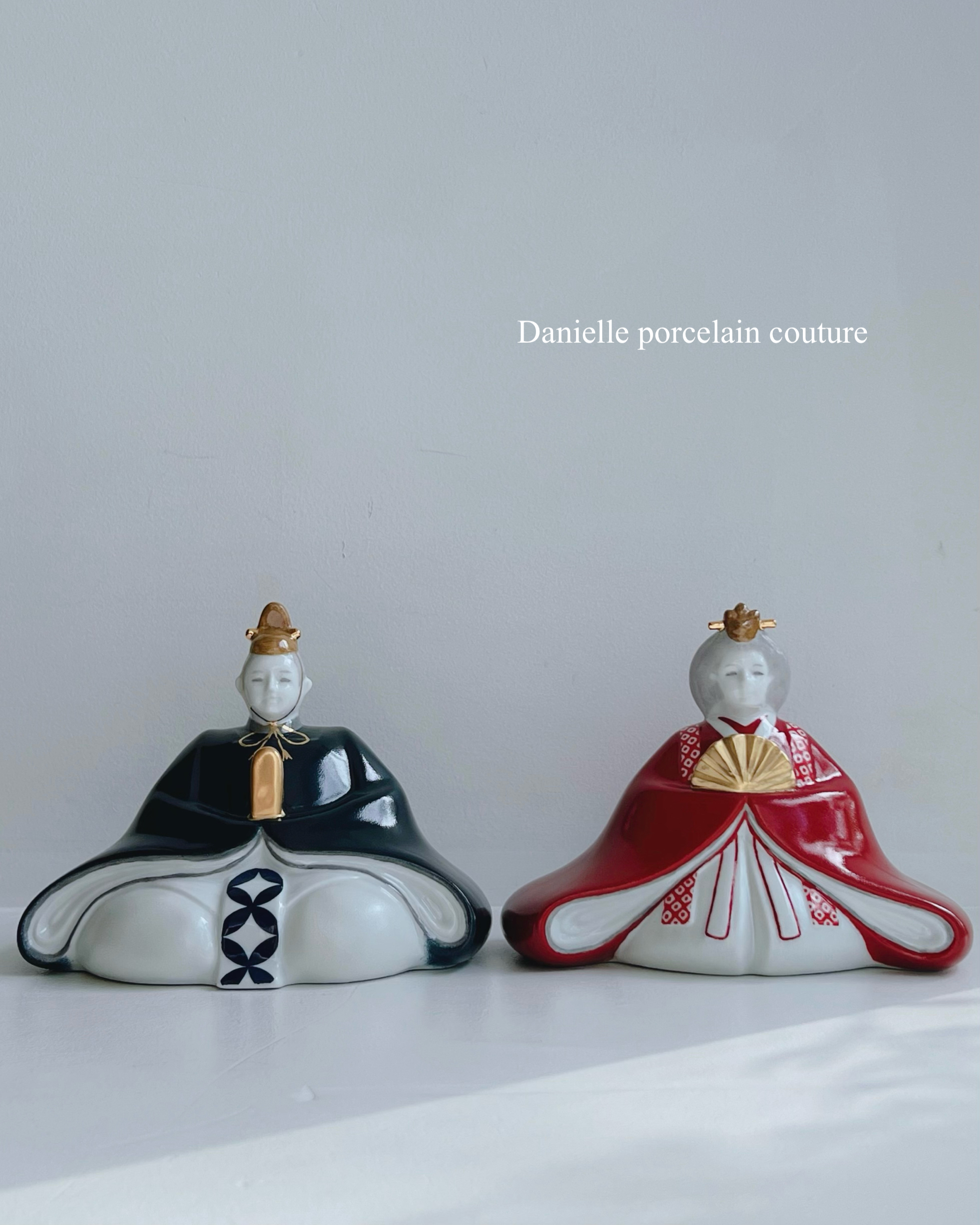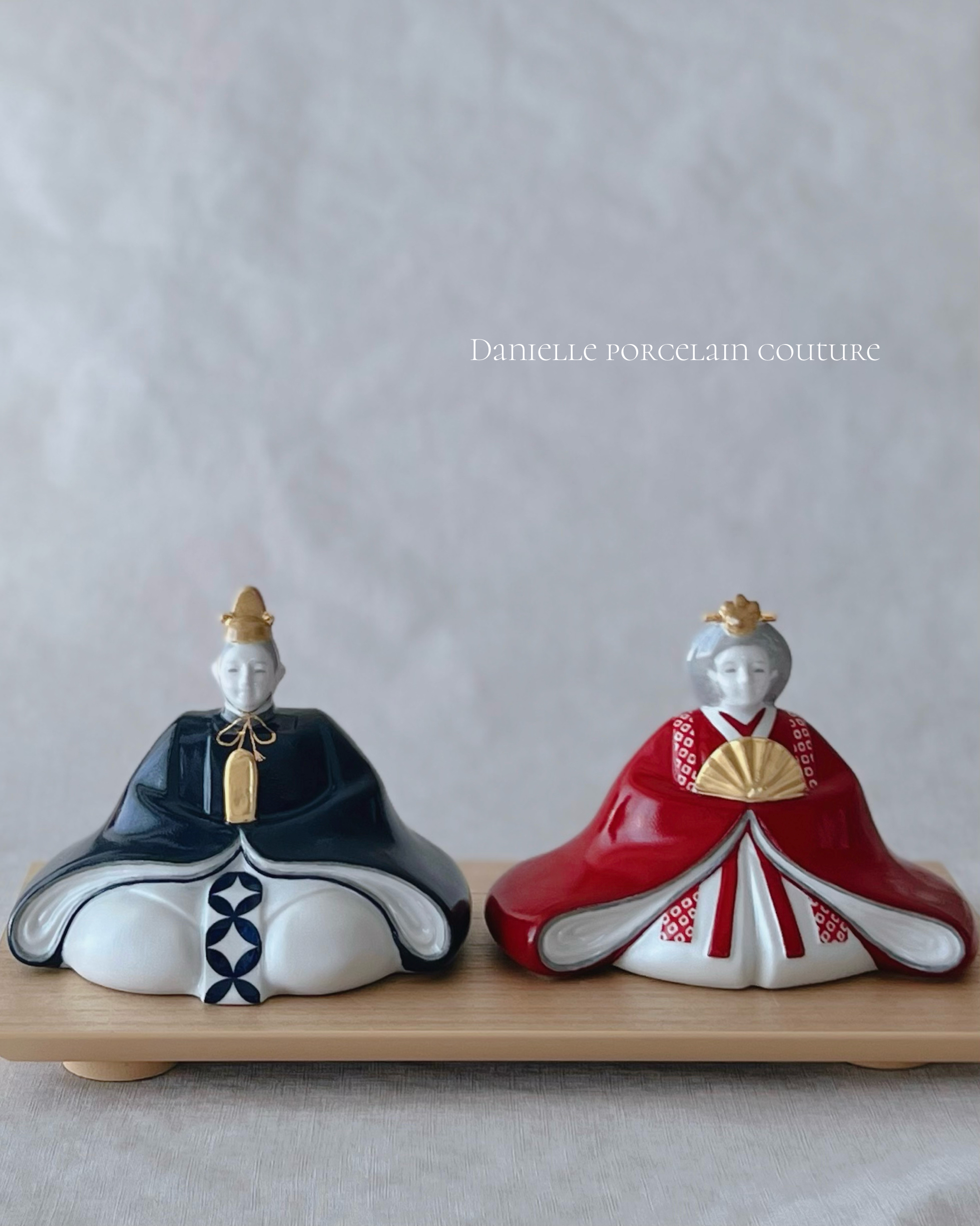 お雛様は真紅の赤色、お内裏様は深みのある紺色のお着物を纏い、白い所にはパールホワイトの上絵の具を施してあり、伝統的ながらモダンな華やかさがあるデザインです。